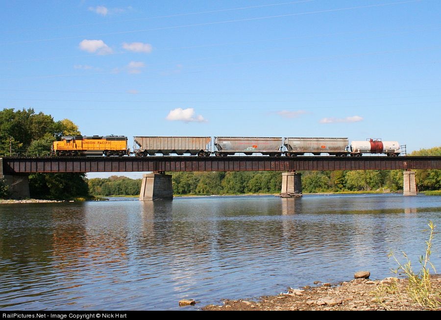 UP GP40-2 1531 leads the North Local south over the Kankakee River in Wilmington.