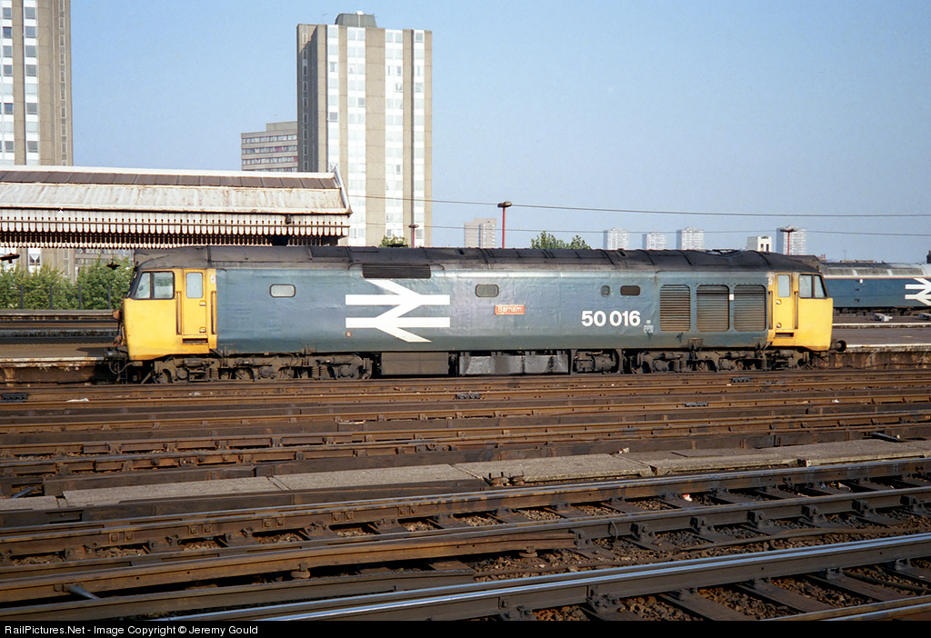 | 50016 'Barham' catches the morning sun while running light engine at Clapham Junction. Barham was withdrawn in August 1990 and cut-up at CF Booth, Rotherham in June 1992 (info courtesy WNXX.com). |