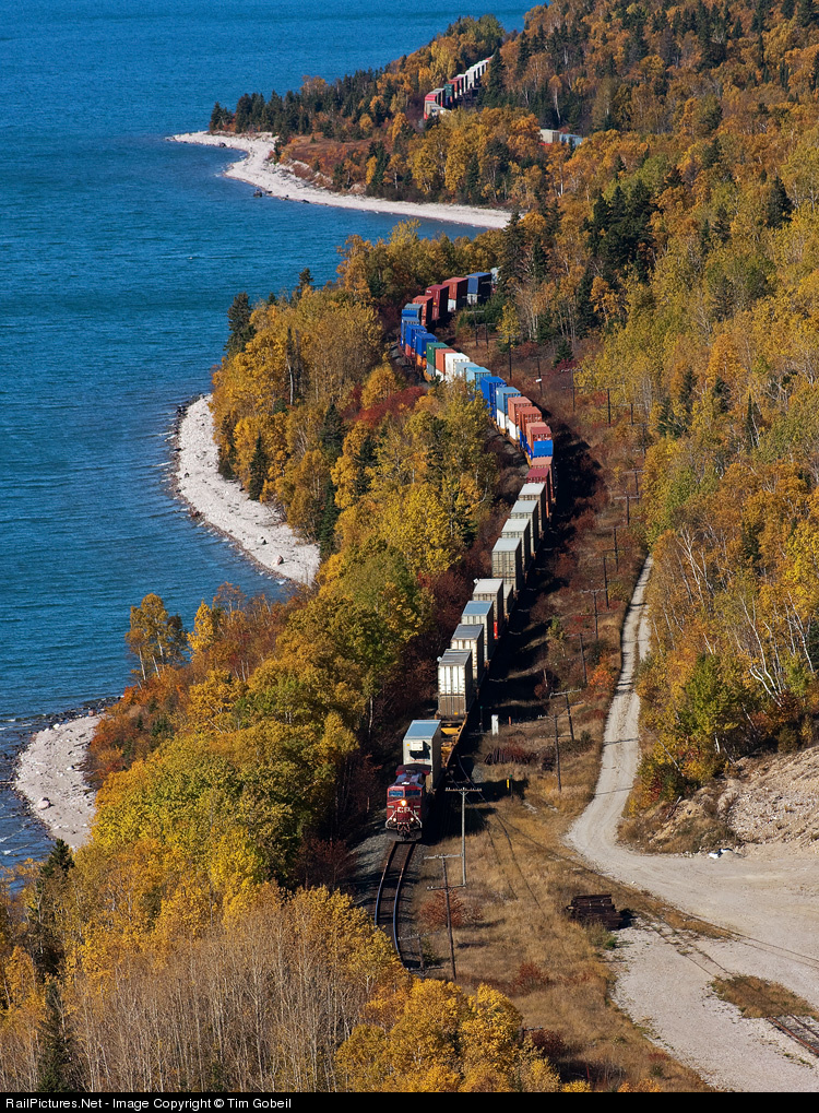 | As the fall colors begin to peak, CP 9668 twists through the curves along the shores of Lake Superior's Cavers Bay after sitting in the siding at Gravel for over 2 hours account CP's brilliant idea of running 10 000 f.t trains with 6000 f.t sidings. |