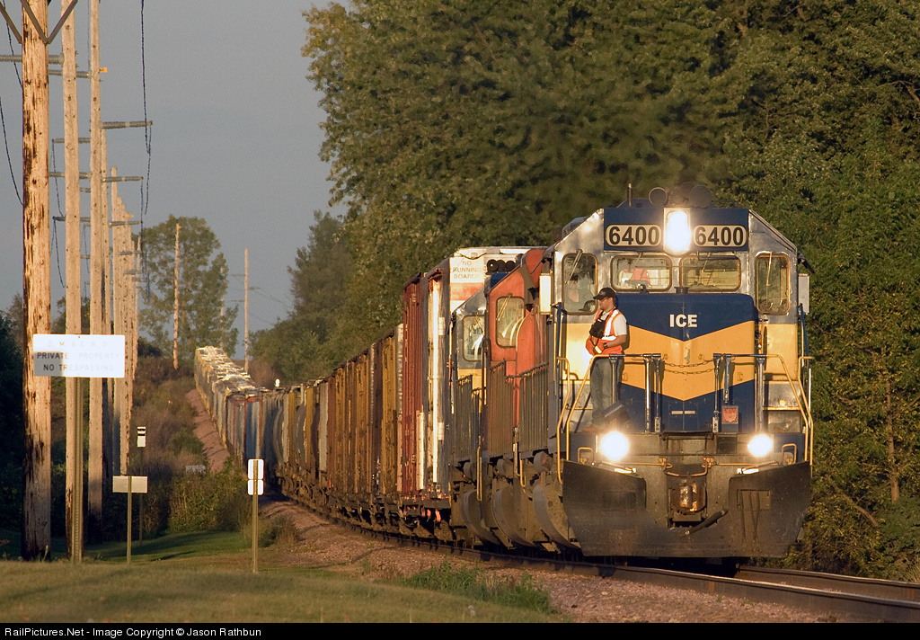 | Under the last rays of a glaring sun, ICE 6400 slows to a hault outside of a quiet SE Minnesota town. The crew would proceed to uncouple about 8 cars back and deliver them to a siding on the other side of town. |