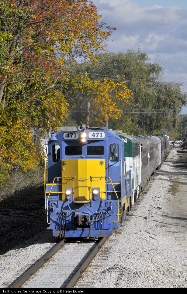 Orrville Railroad Historical Society sponsored Fall Loop excursion train departs Medina, Ohio at 4:30 pm heading west for Spencer where the train will turn south back to Orrville after a day circle trip. Trailing engine is an FP-9, but it was nearly dark before it was the lead engine.