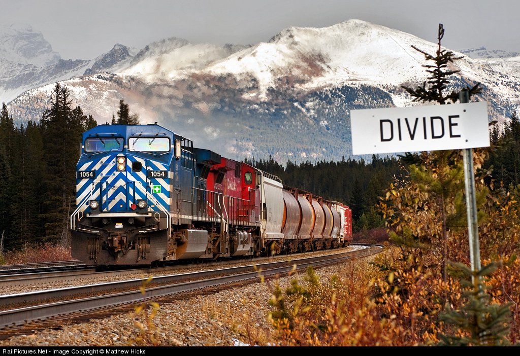 | A westbound manifest train crosses from Alberta into BC, from atlantic to pacific drainage, and from sunshine to cloud. |