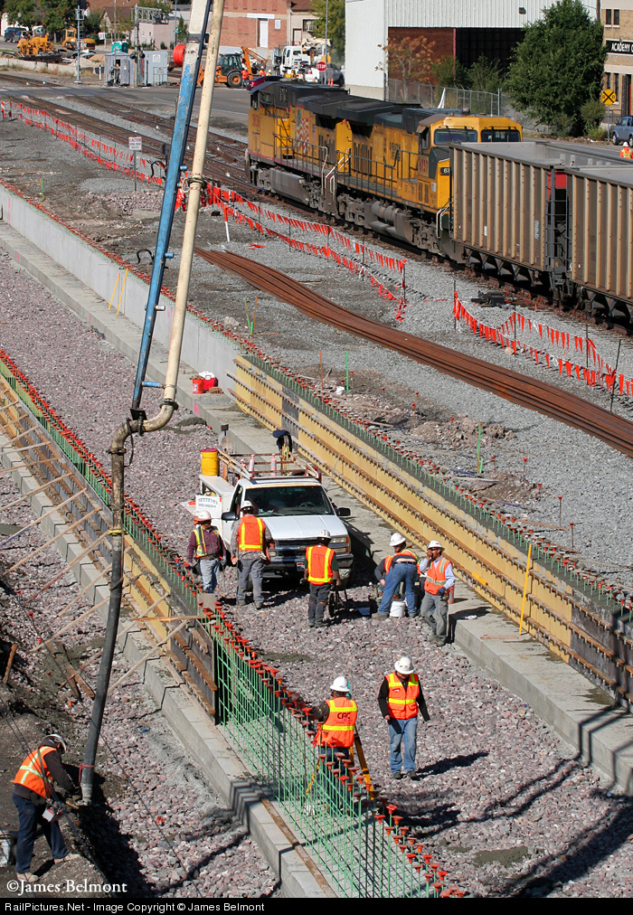 | Union Pacific's MNYRO slowly departs Provo with a 140 car manifest for Roper yard. At left, Herzog, Stacy and Witbeck crews work to create a new commuter rail station for future FrontRunner service from Salt Lake City. This northwestern perspective is via Provo's University Avenue overpass. |