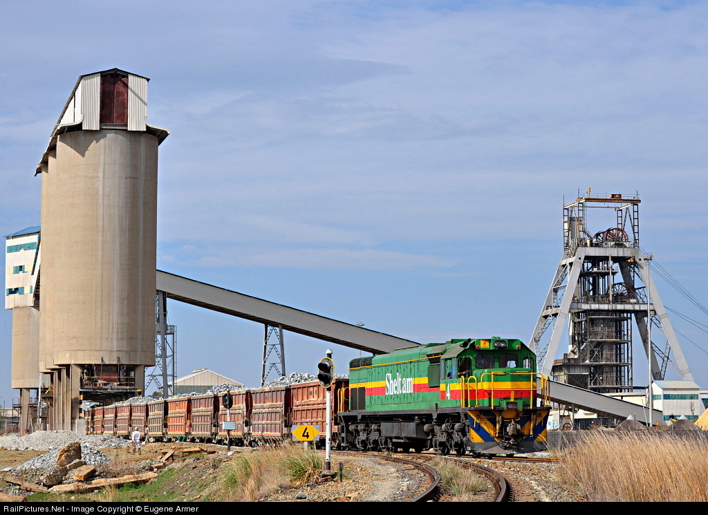 Sheltam no.4 (ex-SAR class 34-200, EMD 1971) departs from Cooke 3 shaft with 11 loaded ore hoppers, bound for Cooke reduction plant.