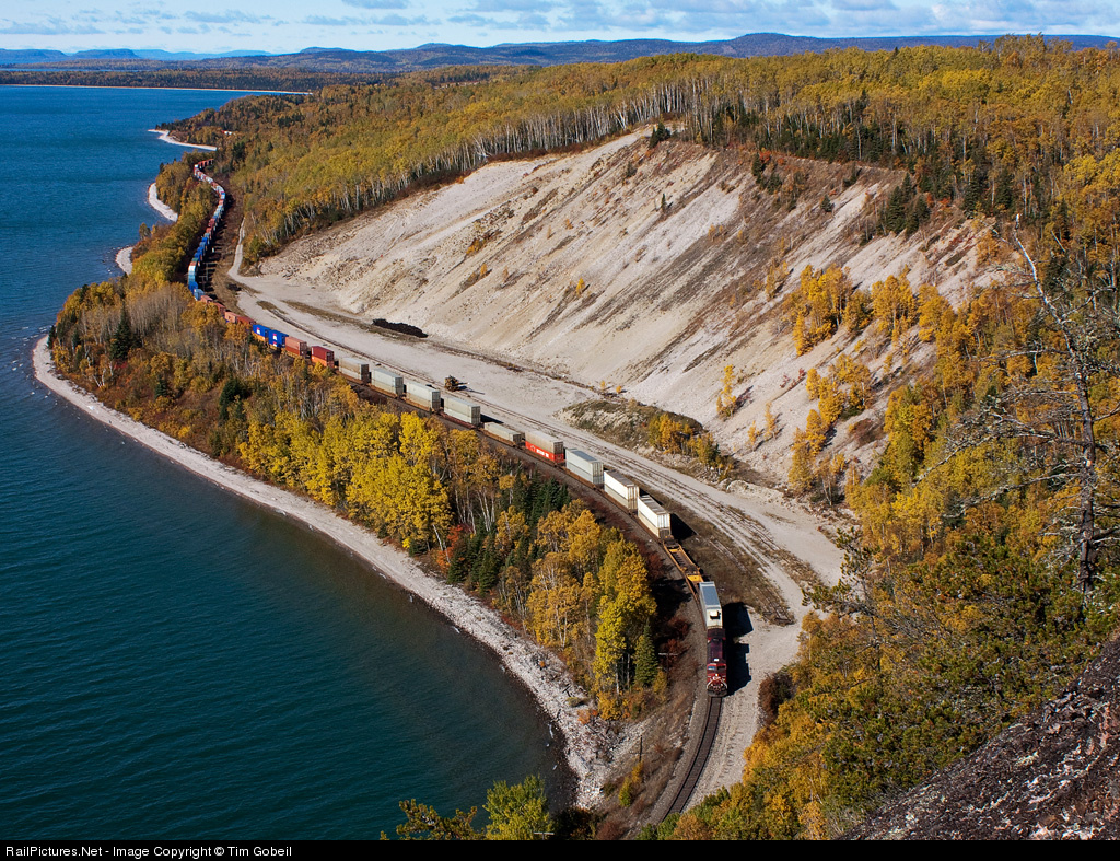 Looking down from a steep rock bluff, CP 9668 twists & turns along the North Shore of Lake Superior at Cavers. It is passing alongside the abandoned Cavers gravel pit before turning 90 degrees and running along the shores of the big lake through the 2 cavers tunnels.