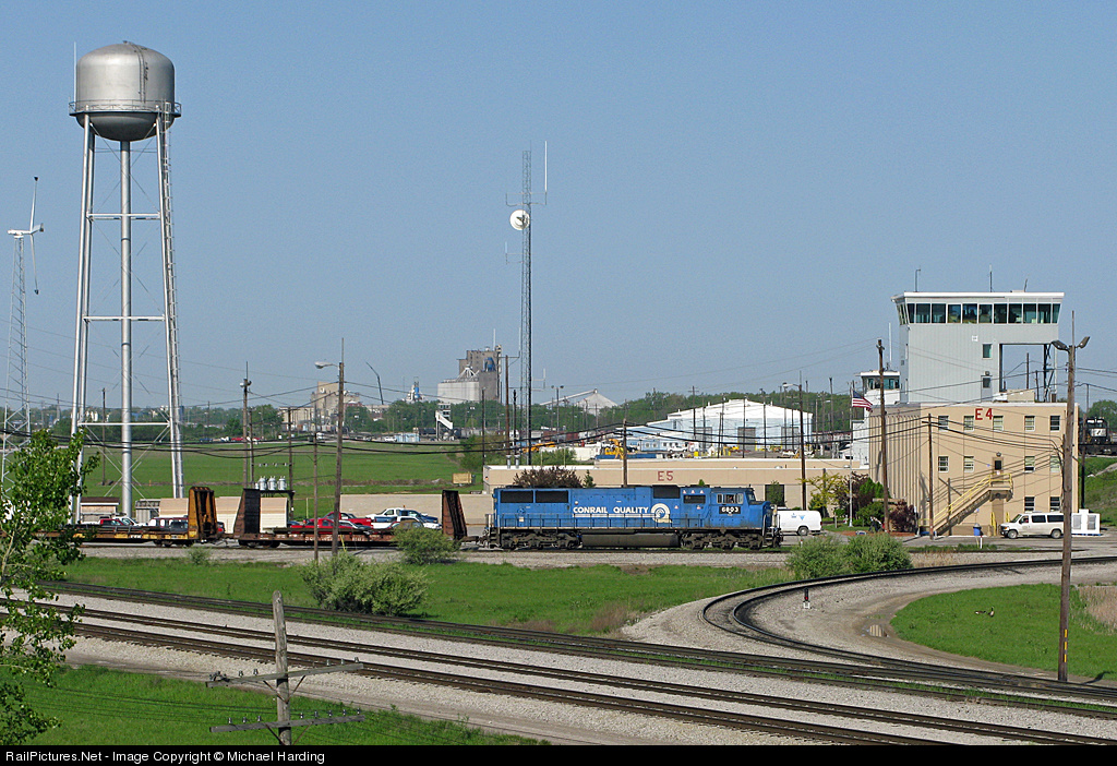| A little different angle on Bellevue shows several yard structures from the wind turbine on the left to several buildings on the south side of the hump which the Conrail SD60M is about to duck under. |