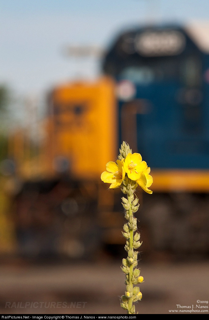 Flower and power - One of the two locomotives assigned to CSX local B747 rests at the north end of Cedar Hill Yard in North Haven, CT as a late flower blooms. Canon EOS 50D, Sigma 70-200mm f/2.8 EX DG APO HSM Macro