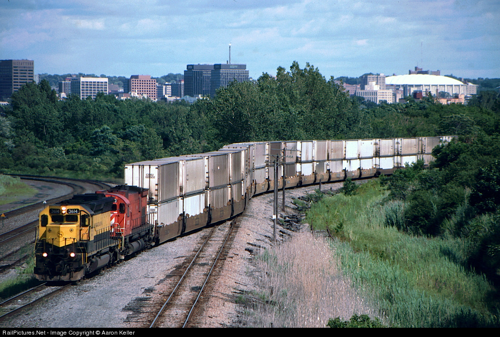 The northbound NYS&W stack train is at the end of its run from New Jersey. It's about to enter Conrail trackage in Solvay. Helping out today is a Delaware-Lackawanna M636.
