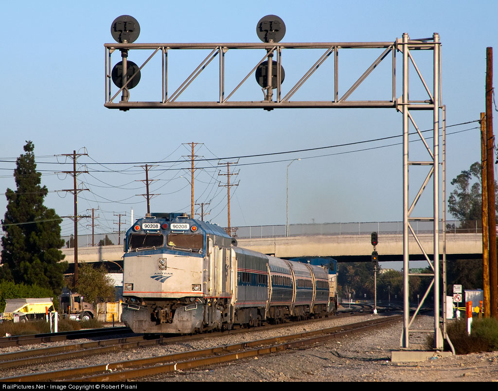 | A "cabbage" F40PH (rebuilt as a cab/baggage car) trails a northbound Pacific Surfliner at Burbank Jct. The consist of this train includes older Amfleet and Horizon equipment. |