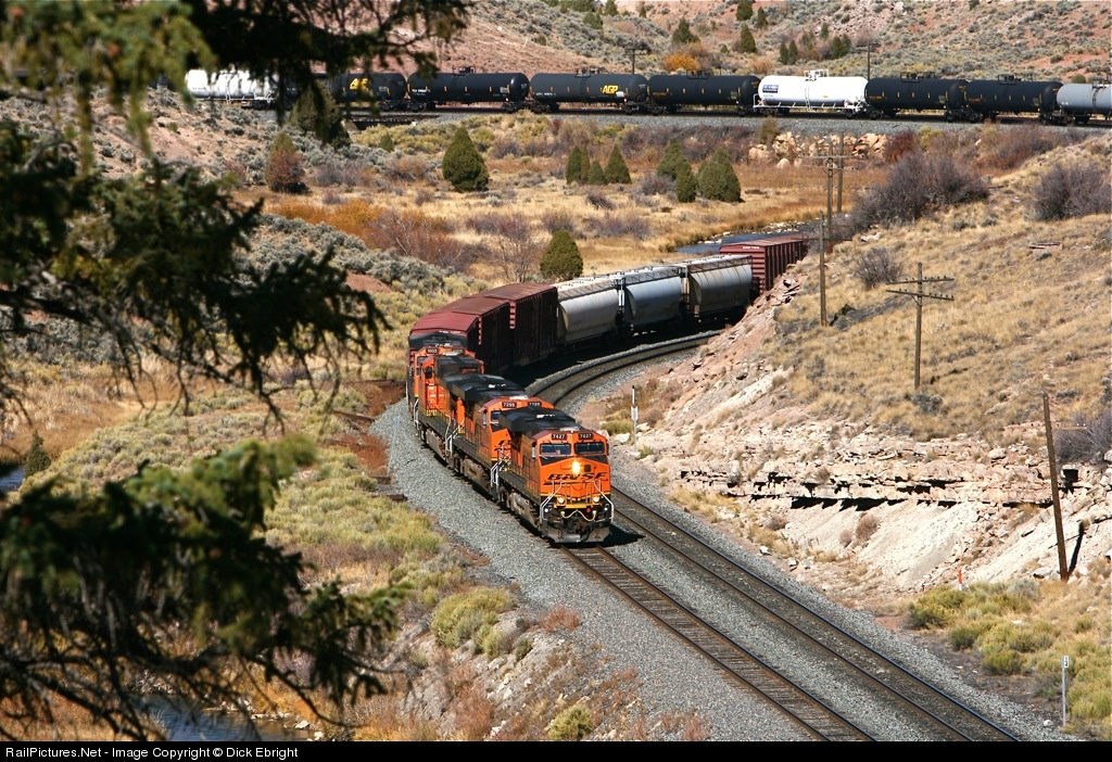 | BNSF 7427 leads the daily Provo to Denver trackage rights train down the east slope of Utah's Soldier Summit. The train is approaching the west switch at Kyune where the rails enter the Price River canyon and the gradient increases to 2.4%.