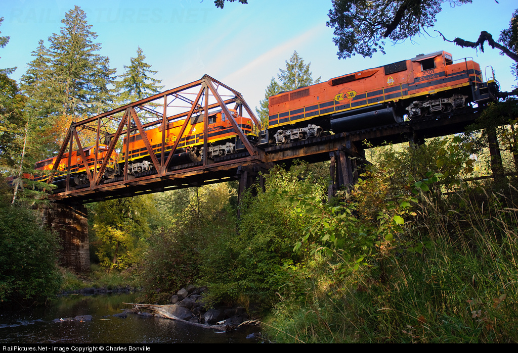 The eastbound Toledo Hauler crosses the Mary's River in the foothills of the Oregon Coast Range a few miles west of Philomath, Oregon. The complete power consist on this day was 3002, 102, 101, 3001, 2313 and 2301, the last three of which can be seen here.