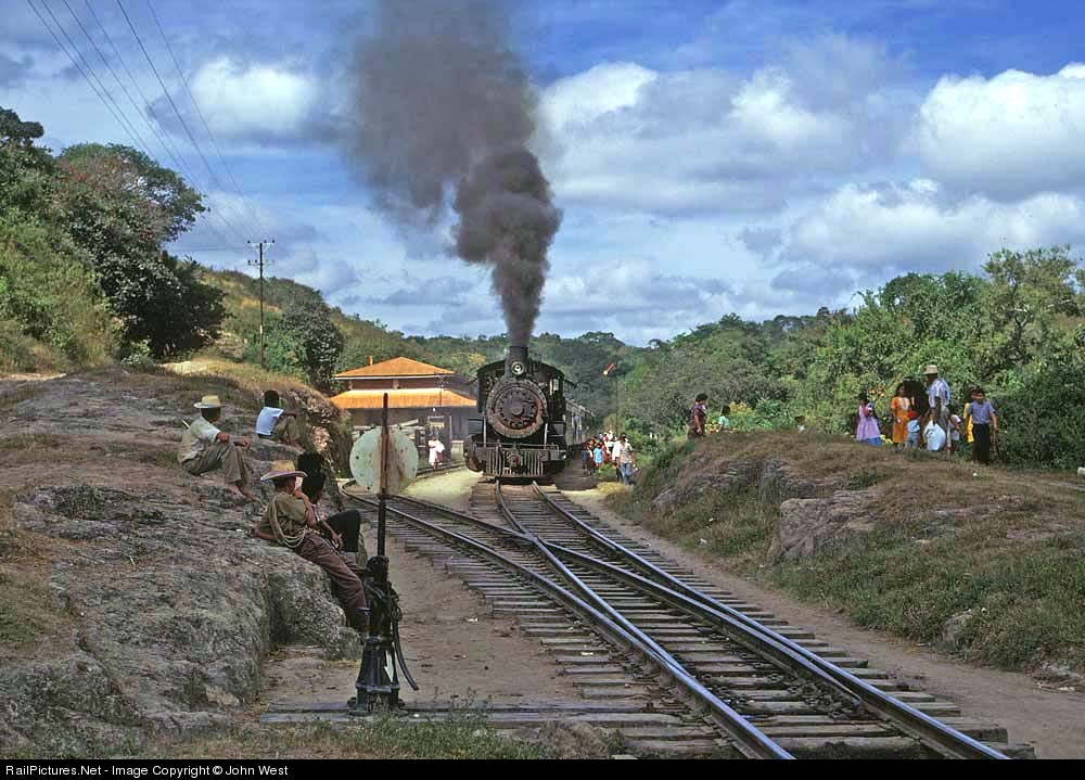 The Guatemala City to Puerto Barrios passenger departs Sanarate. Only a few years prior this train would have been diesel hauled, but a shortage of cash for imported diesel spares forced first the American-owned International Railways of Central America (IRCA) then nationalized successor Ferrocarriles de Guatemala (FEGUA) to "steamize", returning long stored steam engines back to service. While the rust on the engine's smoke box reflects those problems, the track was still in first class condition, reflecting the once high maintenance standards of the IRCA (good surface and line, and note the spring loaded frog.) Thanks to Tom Moungovan for helping update the location info.....the memories are fading!