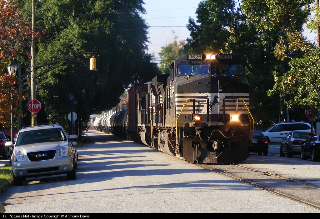 | General Electric vs. General Motors! Augusta Street Running! NS 9626 splits down the middle of 6th Street, bringing morning traffic to a halt as seen at this intersection at Telfair Street. NS 9626 is the leader of this morning's NS 192. Now with Daylight Savings Time around the corner, it's harder to get shots from my usual shots so I had to think a little outside of the box today! |