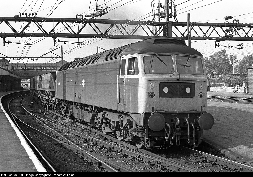| Raiding the old negatives for scanning, I came up with this old view from 1980. Class 47 no. 47 351 passes through Guide Bridge Station with a Merry-Go-Round coal service heading back to Yorkshire with the empties. The station has completely changed now, being reduced to just two tracks and two platforms and most of the buildings have been demolished. The loco was built in July 1963 and withdrawn in January 2000. It was finally cut up in February 2001. |