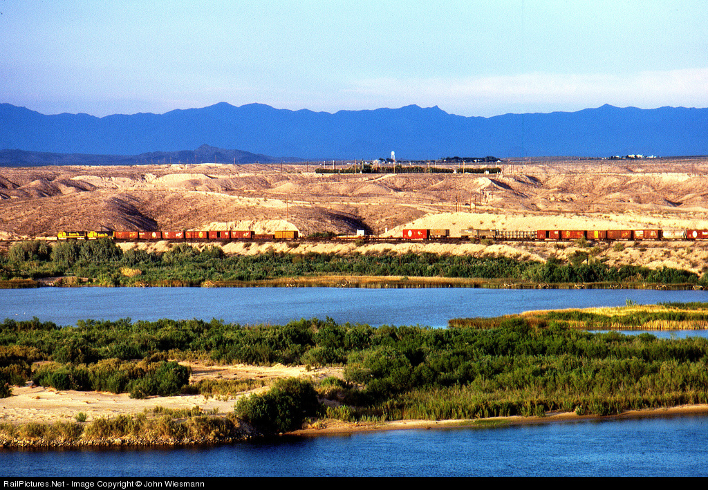 ATSF freight eastbound at the Arizona border of the Colorado river, as seen from Topock in the evening sunlight