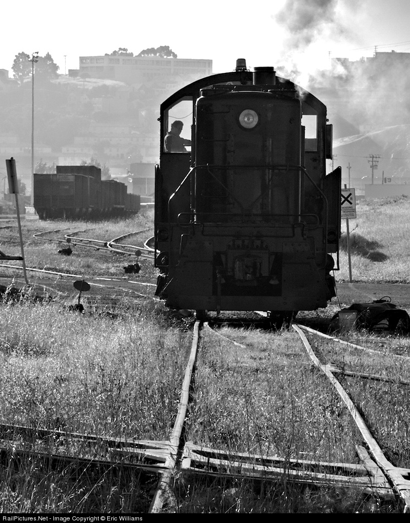 In the process of a full cosmetic restoration to match it's original San Francisco Belt Railroad livery, the unit is taken out for a test run in the yard prior to applying the yellow safety striping. The freshly applied black base paint makes for a stealthy locomotive.
