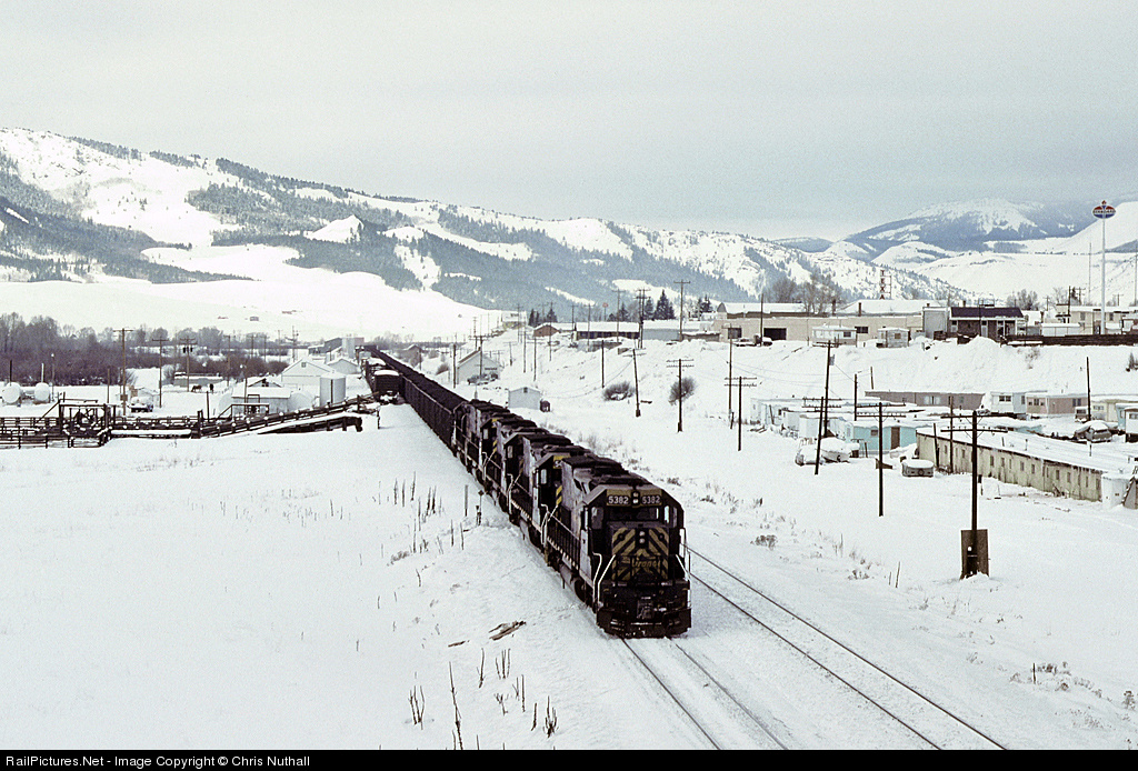 Led by 5382, five Tunnel Motors on an eastbound coal await a meet with the westbound Rio Grande Zephyr at Granby in January 1982.