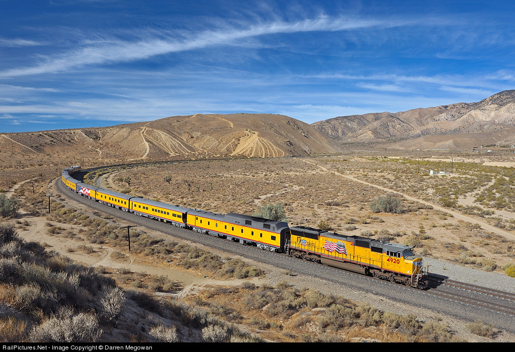 | An SD70M leads a Union Pacific passenger special around the big curve at Warren on the eastern side of the Tehachapi Pass. This train will leave home rails in just a few miles at Mojave, head east on BNSF's Mojave Sub, and then back onto UP rails at Daggett for the remainder of the trip to Las Vegas. |