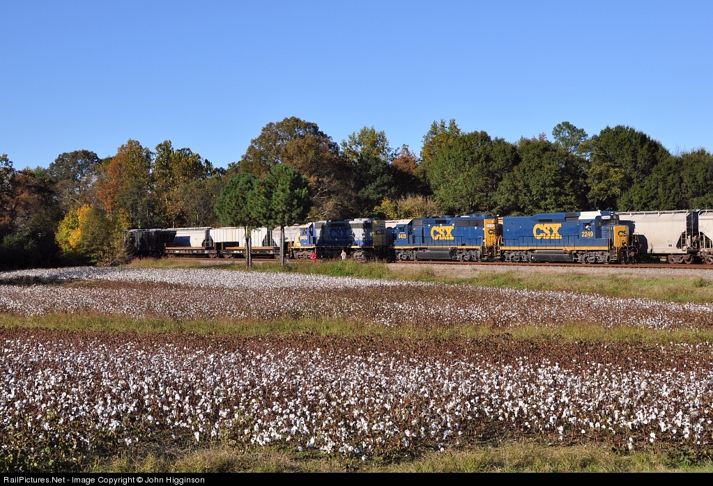 Q649, led by a Road Slug set and an SD40-2, races south past a cotton patch in Hartselle, while G213 waits in the siding. If you look in the vicinity of the third unit, you will see some folks who were taking pictures of their kids on the train tracks, a sight which made this photographer (and the train crew, undoubtedly) more than a little nervous.