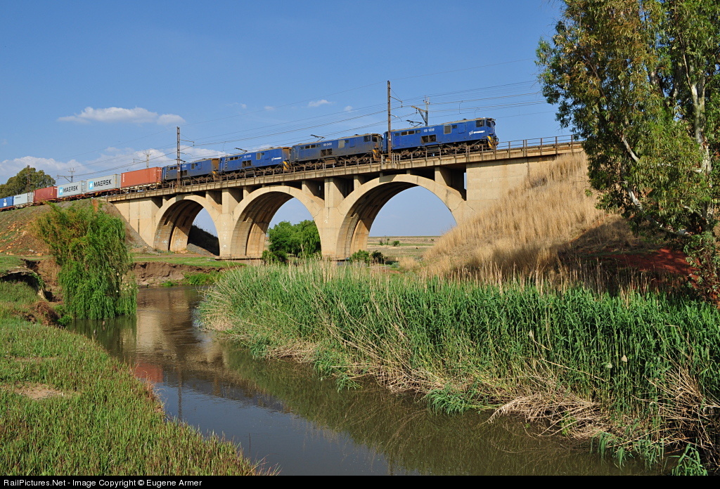 | The Johannesburg - Durban mainline, often referred to as the Natal Corridor (Natcor) is electrified double track with bi-directional CTC. These four class 18E's are running "wrong main" on an eastbound container train, crossing the Blesbokspruit just north of Heidelberg station. |