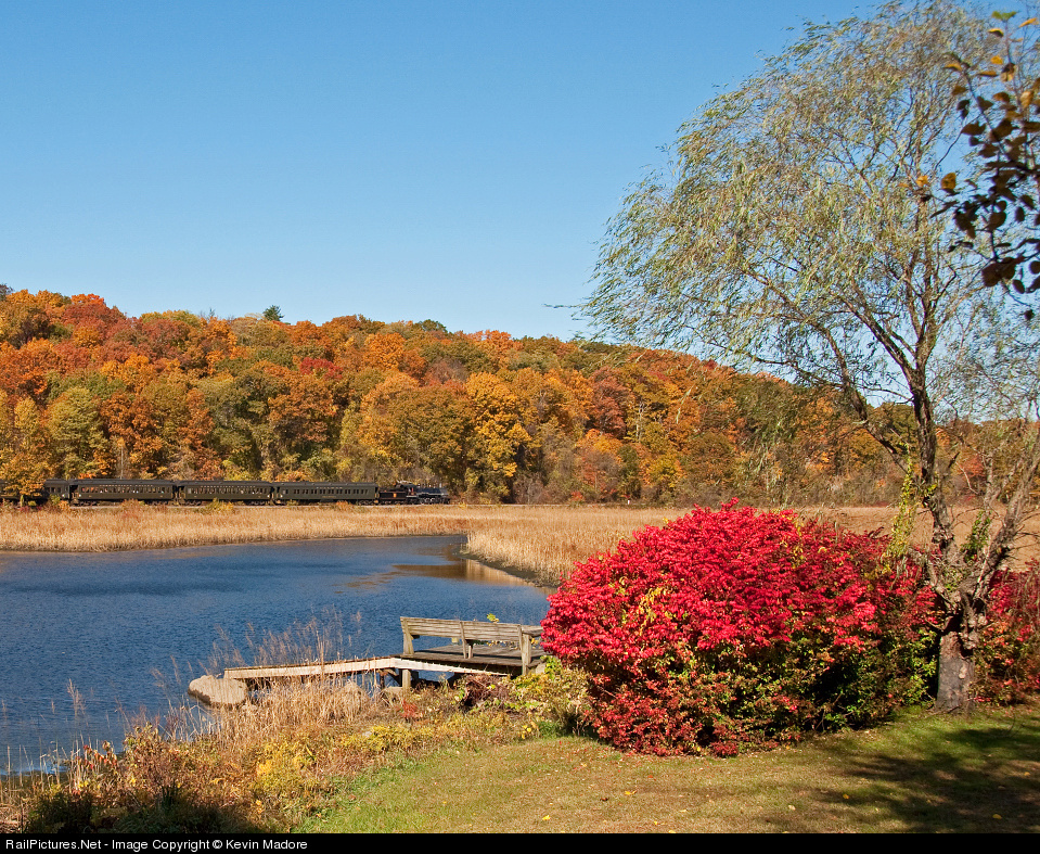 | New England Color is still in evidence as the Valley Railroad's first steam excursion of the day heads north along the Connecticut River at Pratt Cove. The train will take its patrons north as far as Chester, before returning to Deep River Landing, to make a connection with the riverboat Becky Thatcher....and an opportunity to view the fall foliage from yet another perspective! |