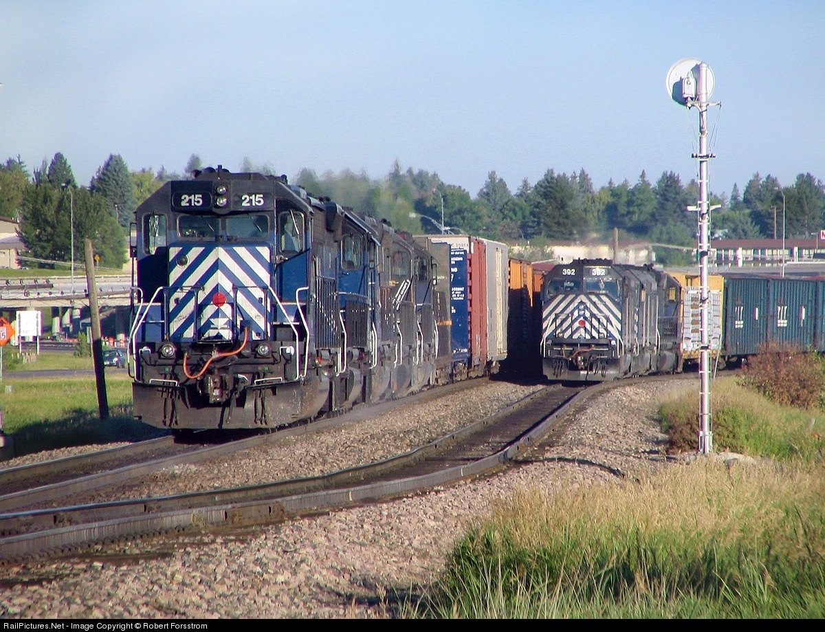 | At the bottom of the hill with pushing duties over for the moment, the crew aboard an an assisting helper set (MRL 215) prepares to cut off the rear of their westbound and assist the M-L (waiting in the hole with MRL 392) back up Bozeman Pass eastward. |