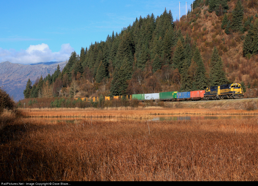| A Seward bound freight wends its way south on the ARR mainline between Girdwood and Portage. This train features a slug of traffic for Whittier which will be set off at Portage before the train makes a turn over the mountain to Seward and back before ultimately tying up for the night in Whittier. |