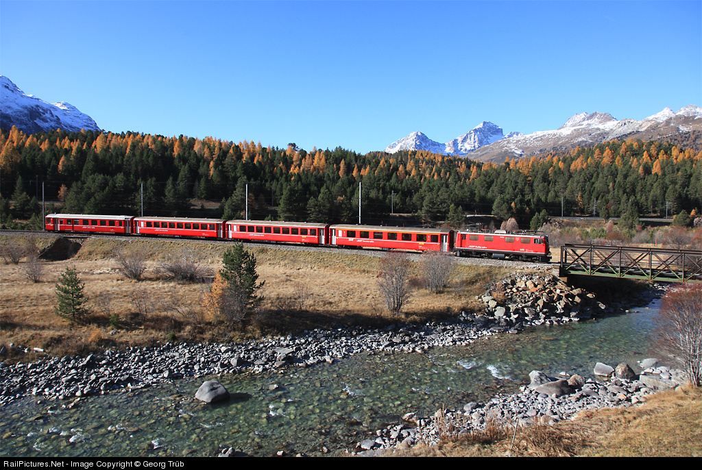 | More than 60 years old Ge 4/4 I 603 "Badus" (built in 1947 by SLM/BBC/MFO) is still in regular service. With regional train 1932 from Pontresina to Samedan-Ardez she will cross Flaz creek near Punt Muragl stop in a few seconds. |