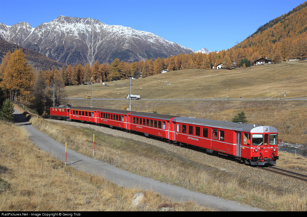 | Pushpull train with cab car BDt 1721 and locomotive Ge 4/4 I 603 shoving in the rear from Ardez to Pontresina near Punt Muragl. The more than 60 years old Ge 4/4 I will disapear soon. |