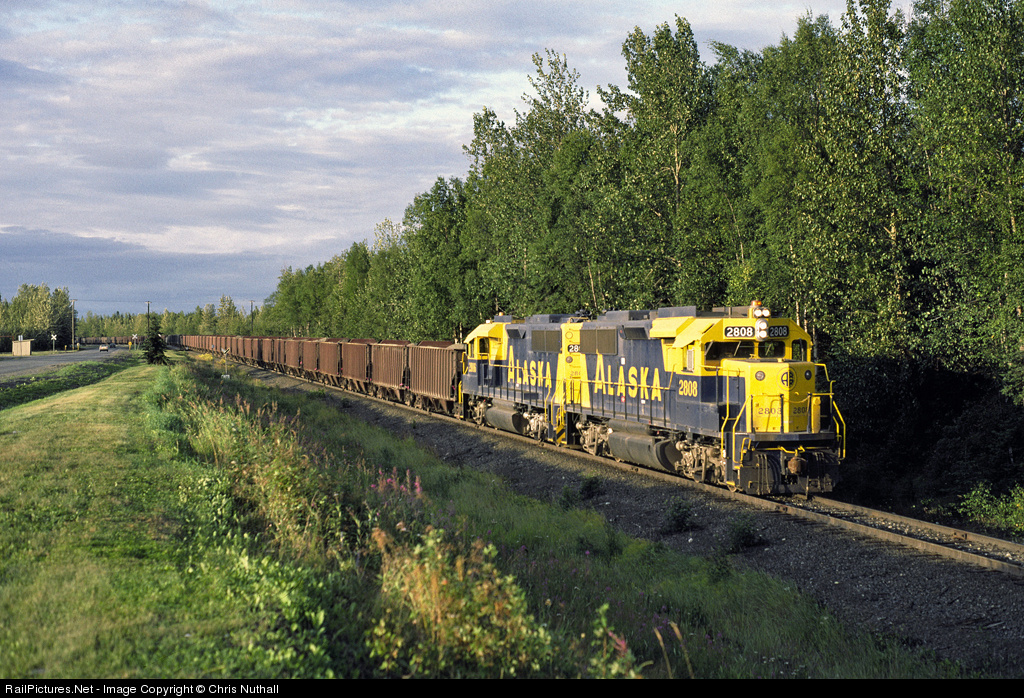 A shot probably not obtainable nowadays due to security issues, 2808 and 2806 rumble through the Elmendorf Air Force Base grounds with a southbound gravel train during late evening in August 1985.