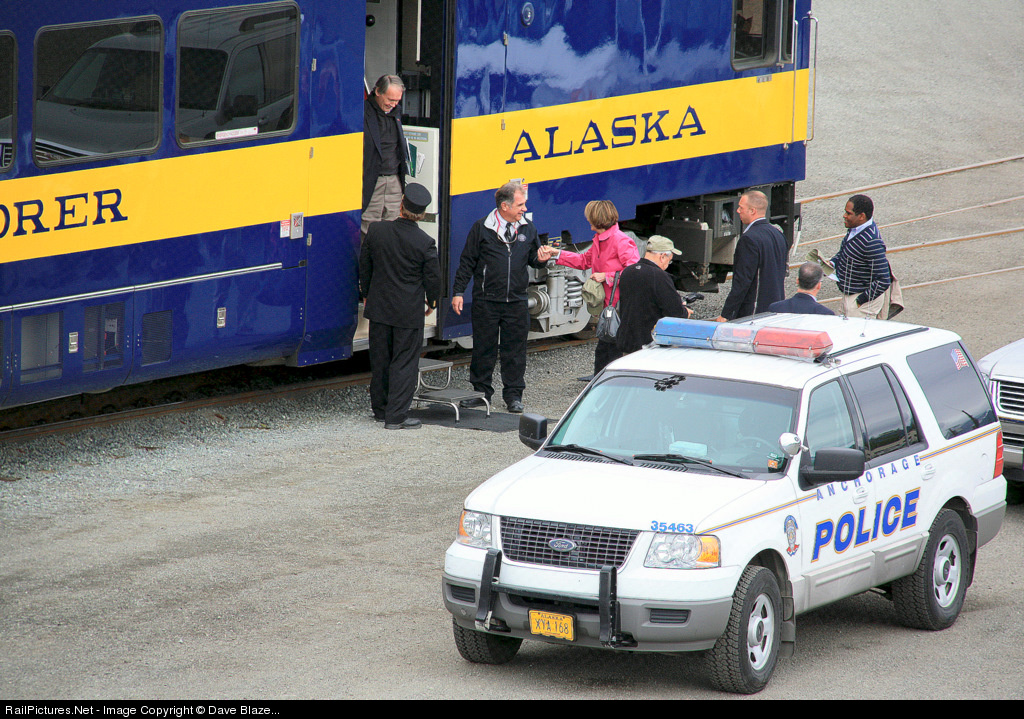 | United States House of Representatives Speaker Nancy Pelosi is seen disembarking from the ARRC's new Colorado Railcar built DMU. Madam Speaker (in the pink jacket) is shaking hands with the ARR's Director of Operating Practices and she is flanked by various US Capitol Police and assorted aides. Her entourage rode to and from Spencer Glacier with high ranking officials from the US Forest Service. They were wooing her for continued Federal Support of their "Whistle Stop" project which is opening up the spectacular but remote interior of the Chugach National Forest for tourism through the use of railroad access provided by this new car which was purchased in part with USFS funds. |