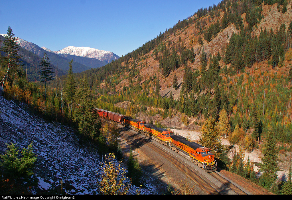 On a beautiful fall morning an early morning manifest is climbing the west side of Maria Pass on what would be a busy day of photography.