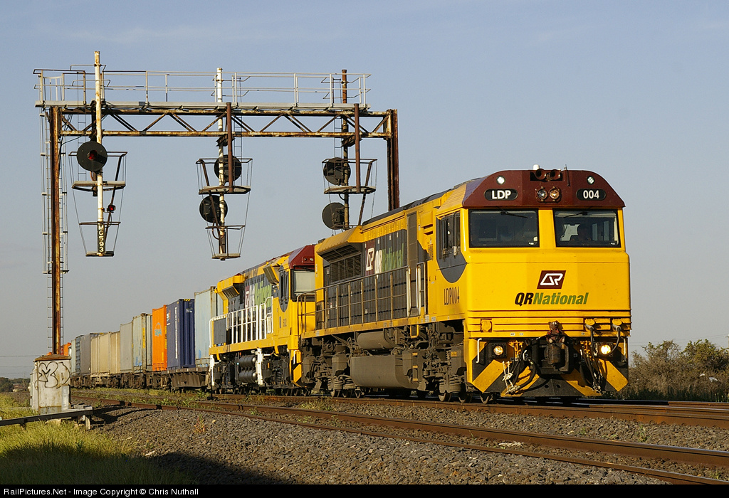 | The two latest offerings for the Australian market from the main locomotive equipment suppliers are represented in this image of QRN LDP004 (Downer EDI/EMD GT46-ACe) and QRN 6002 (UGL Rail/GE C44ACi) with a short 5SM9 service from Sydney to Melbourne, slowly coming through McIntyre due to total CTC failure on the North East line. 6002 was dead attached and on delivery from UGL Rail in NSW to Melbourne.