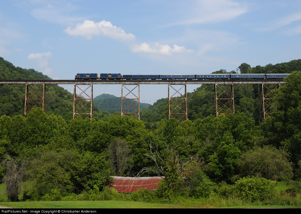 Following the annual maintenance jamboree on the former Clinchfield Railroad, CSX executives make an inspection run across the line. Their OCS is seen here crossing Copper Creek Viaduct behind 9993 and 9998.