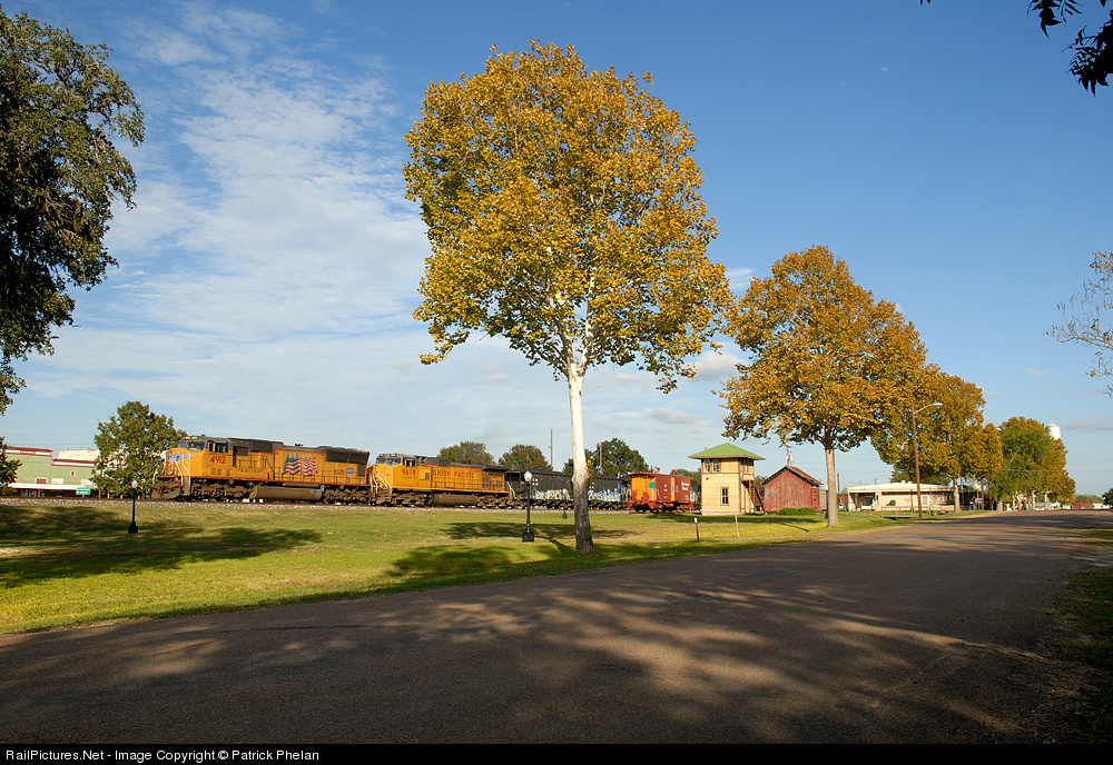 A WB UP mixed freight speeds through the small town of Flatonia, TX on a great fall day.