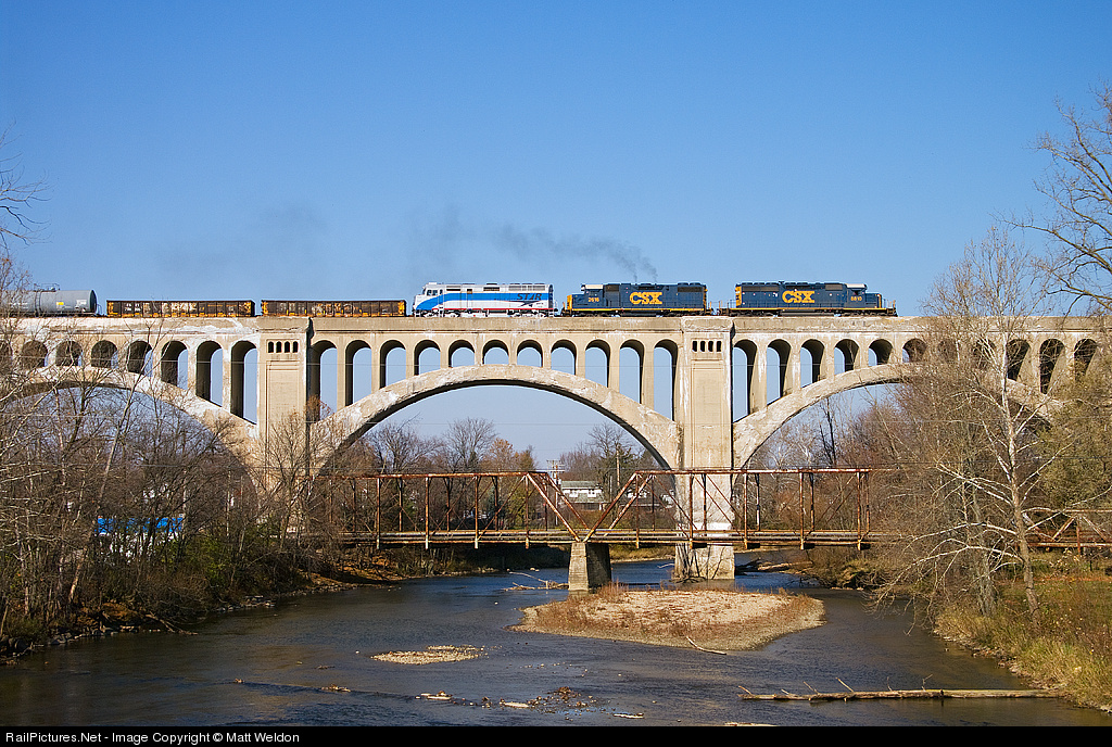 | Fresh off the CSX Toledo Subdivision, the eastbound CSX Q366-07 crosses over the Big Four bridge above the Great Miami River. What a surprise with the Music City Star #120 as a trailing unit. |
