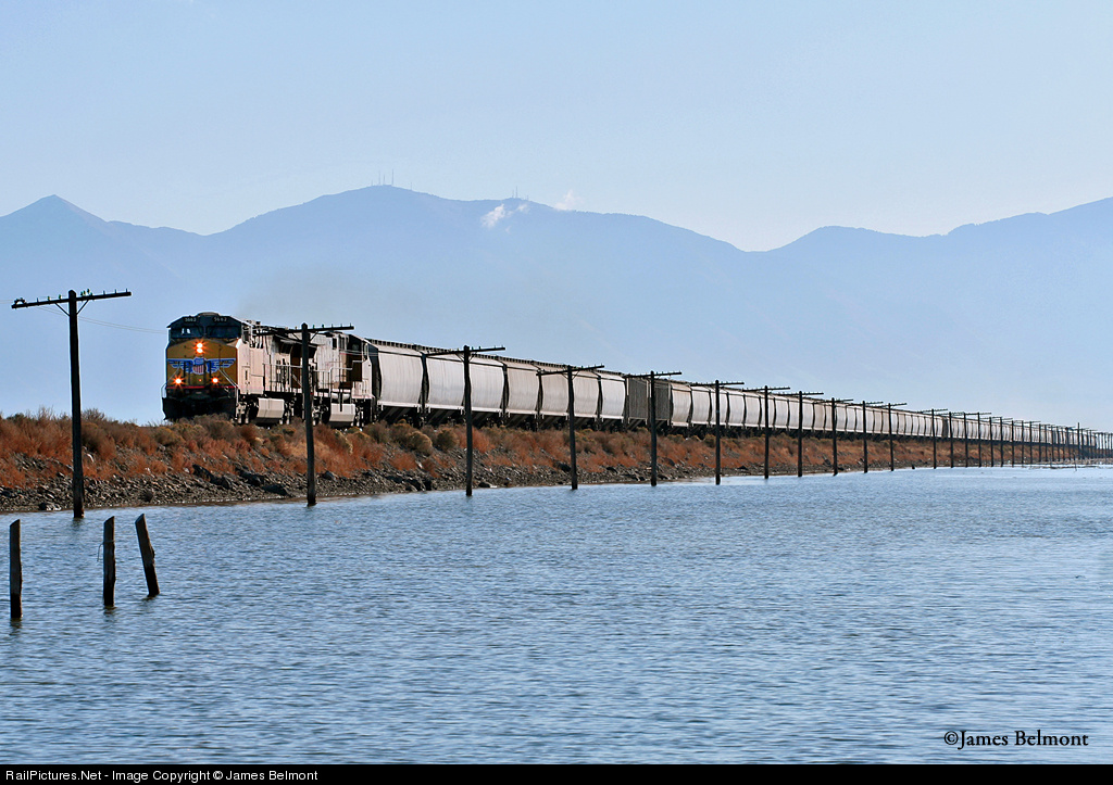 Temporarily surrounded by the briny waters of the Great Salt Lake, a Union Pacific grain train rambles west approaching the CP signals at East Timpie, Utah. This location, sandwiched between the western shore of the lake and I-80 is 889 miles east of Oakland, CA via the former Western Pacific Railroad.