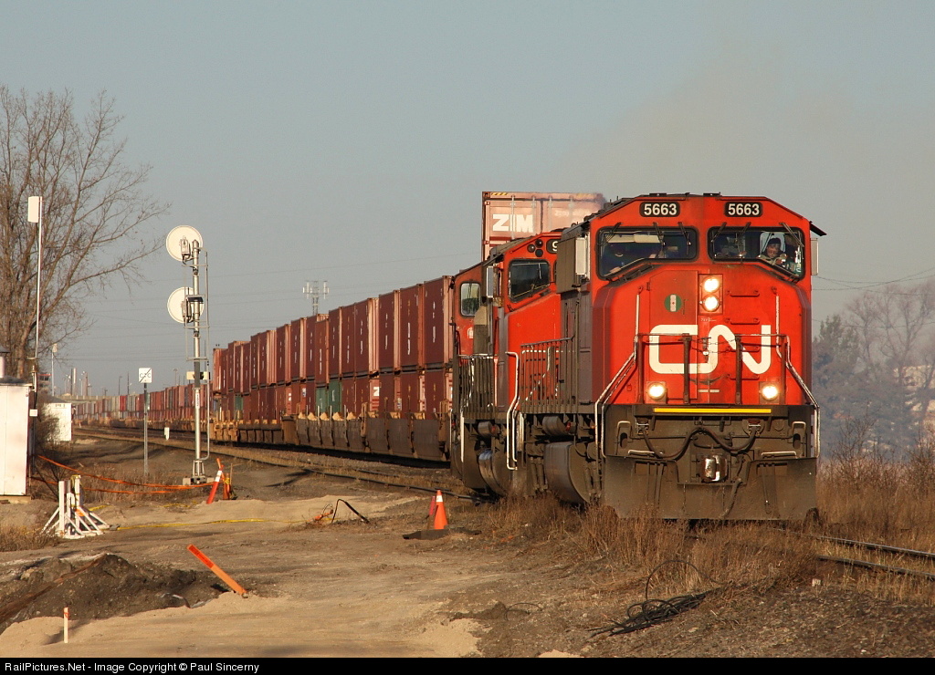 CN 5663 leads a long line of containers out of CN's Symington Yard.