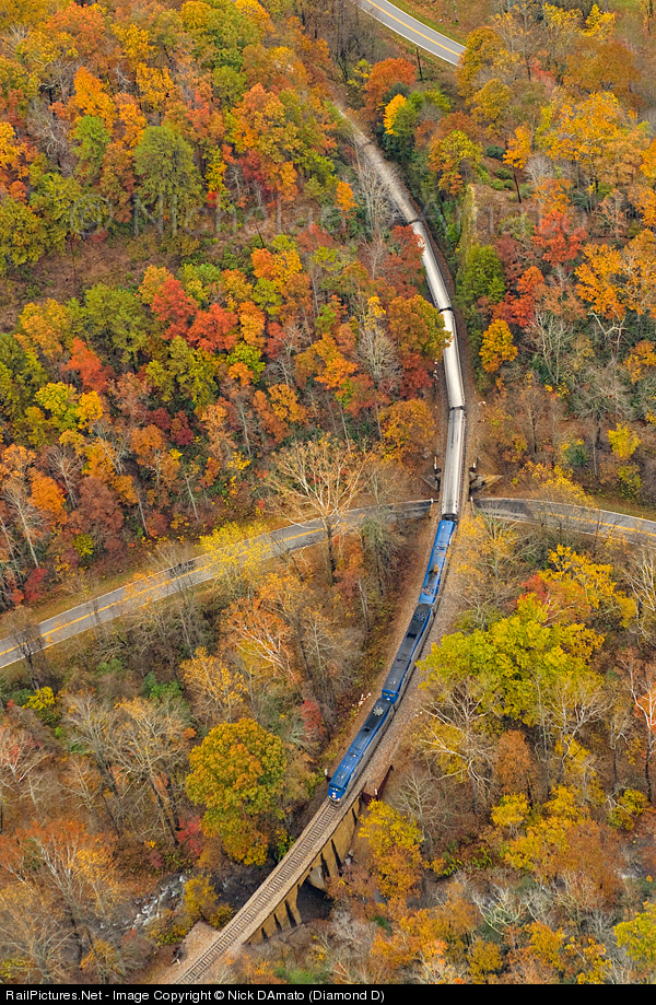 | Passengers on the Old Fort Loops! In this aerial view, we see the North Carolina Transportation Museum's "Blue Ridge Special" crossing Mill Creek on a bridge most folks never see. |