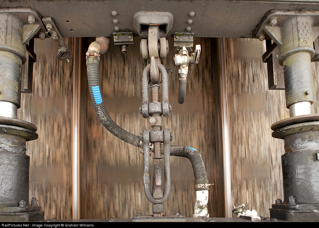 Running at around 20 mph, this is a view of the coupling between the brake van (caboose) and the other wagons on a freight charter on the East Lancashire Railway.