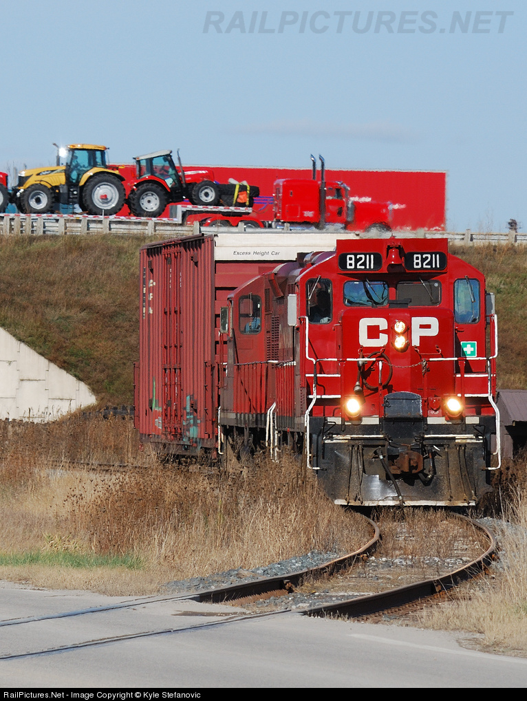 | As a truck of combines flies by above on HWY 403 CP 8201+ CP 8211 trundle along CP's St. Thomas sub with one car for St. Thomas. In a few short weeks CP will hand over the operation of this line to the Ontario Southland Railway making shots like this of the CP on the line impossible to get. |