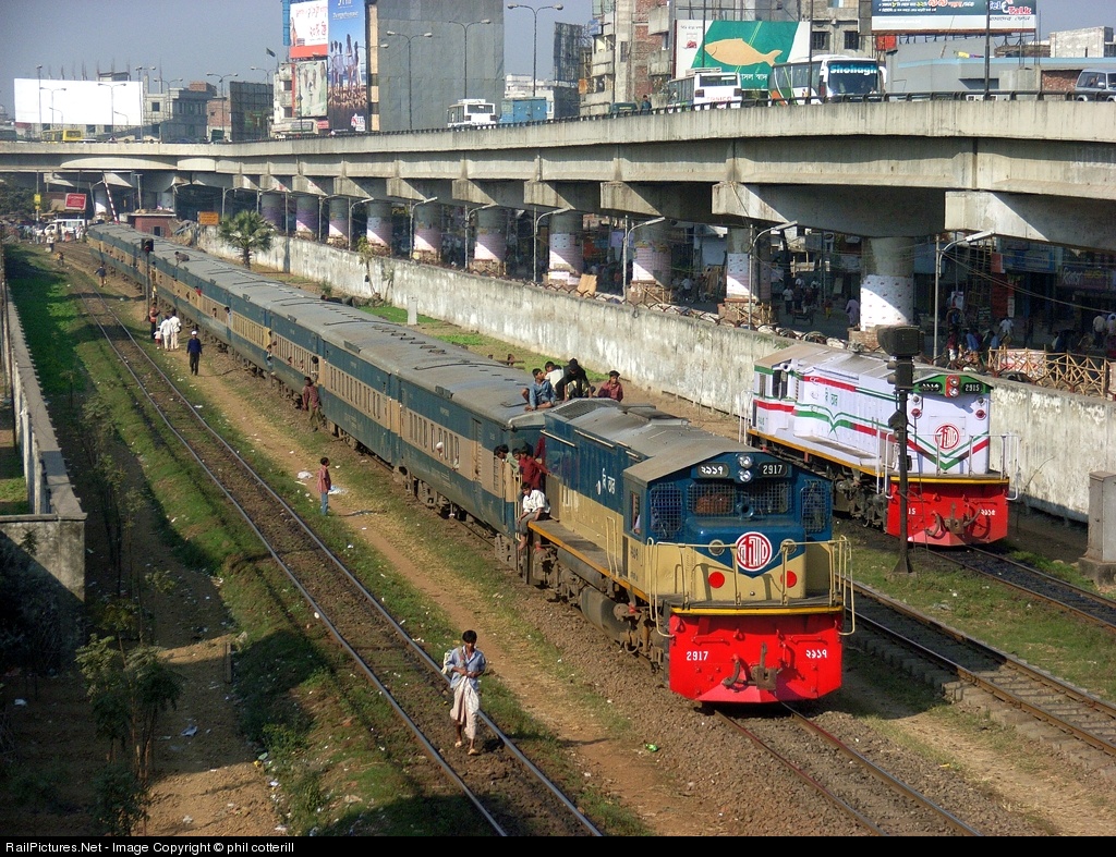 | Metre gauge 2917 approaches Dhaka Kamlapur with the 0730 from Sylhet. sister loco 2915, in pink livery, waits to drop down to the station. |