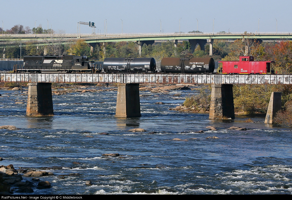 | NS train V30 is returning from dropping off seven syrup-filled tank cars at the Coke Plant in Highland Springs, VA. Engine #3385 was part of the former Conrail fleet with road number #6451. |