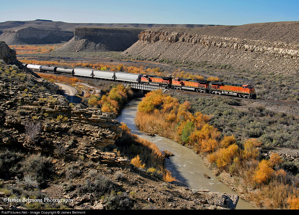 A westbound Burlington Northern & Santa Fe manifest crosses the Price River at East Wash in Utah's Wellington Canyon. BNSF 7667, an ES44DC was built by General Electric at Erie, Pennsylvania in January 2005.