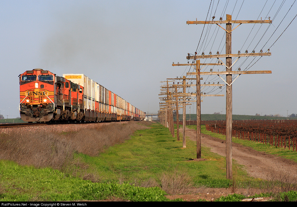 On the morning of the famed slideshow "Winterail", a hot Eastbound Z train screams through the flatlands of the San Joaquin Valley, while the tracks are still lined with old ATSF code line.