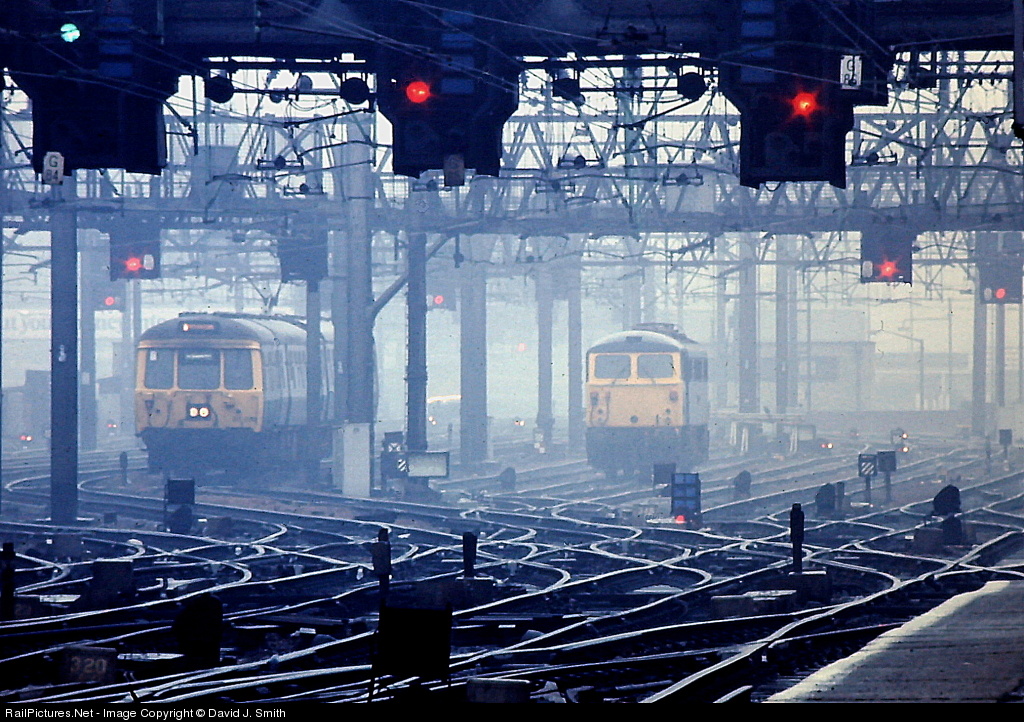 It's 05.30 in the morning at a misty Glasgow Central station,and a suburban unit approaches the station to start the days work,whilst a class 87 waits at a signal.