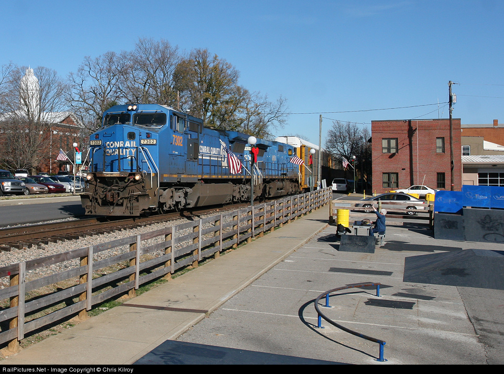 On a beautiful late-Autumn day in Kentucky, two CSX GEs, both still in Conrail blue paint, head up a southbound autorack train through the tranquil town of LaGrange. The train has just exited the three blocks of famous street running through town, as a local enjoying lunch gives the crew a hardy wave from her perch at a picnic table nearby. In the background, the Oldham County Courthouse rises through the bare trees.