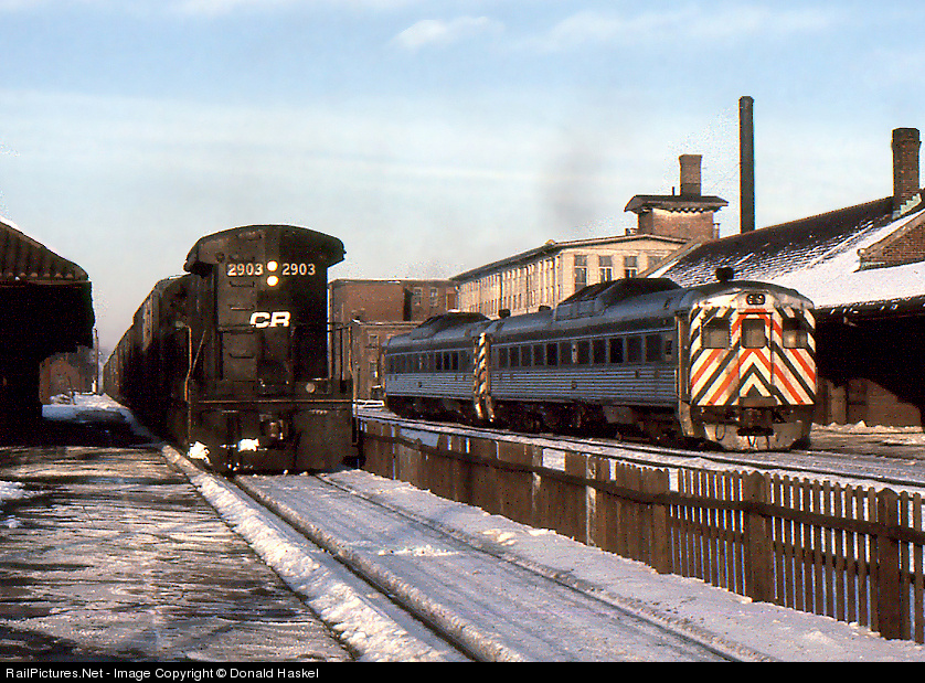 Conrail local freight and MBTA RDC’s down by the station early in the morning on a cold winter’s day. The RDC is still wearing the New York Central livery. The winter advantage that RDC's had over coaches was that you did not see the tracks through the holes in the floor and, you did not have to scrape the frost off the windows. The U boat has a snout that only a mother could love.