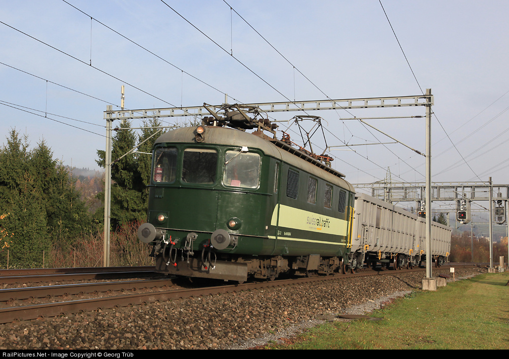 | Re 416 628 is the former SBB Re 4/4 I 10039 built in 1950 (then number 439) for light fast expresstrains. Now privately owned and running for Swiss Rail Traffic (SRT), the new painted locomotive is on a "grinding run" with the two "Gondola" cars of type Fans built in France. (grinding the brandnew brake shoes for meaningful results of the following stopping distance measures) |