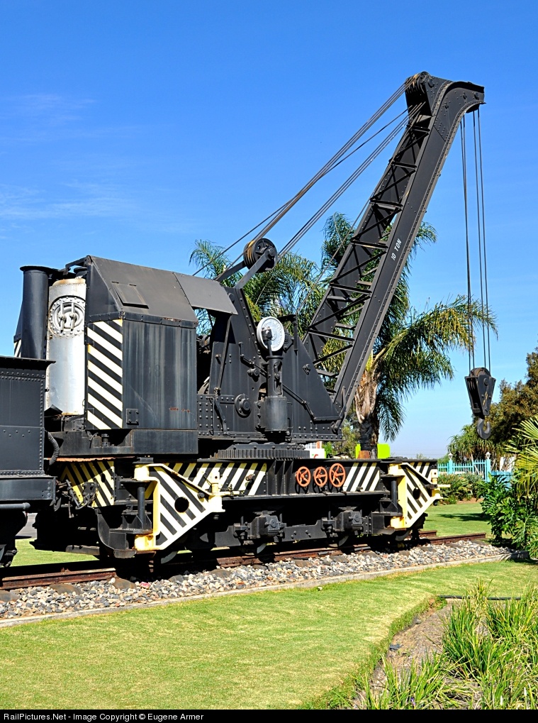 For many years this Cowans Sheldon 10 ton steam crane worked at South African Railways' Koedoespoort workshops. Today the workshops belong to Transnet Rail Engineering and the crane is a museum piece, mounted on a short piece of track at the main entrance to the works. Taken with permission during a Railway Society of Southern Africa group visit.